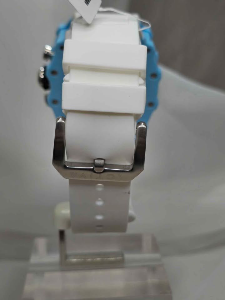 Equipado con tres esferas, este reloj ofrece hora militar, segundero, cronómetro y día en formato numérico, brindándote precisión y utilidad para cualquier ocasión. Sus números blancos sobre un fondo azul añaden un toque moderno y atractivo.